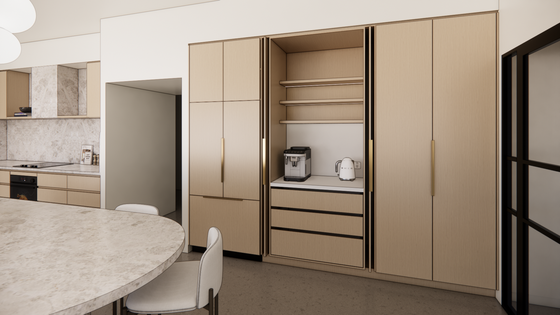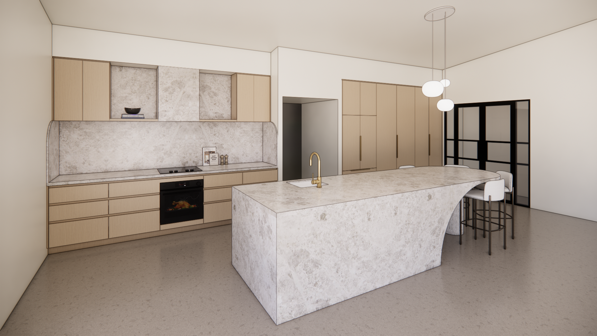 At the heart of the design is a stunning curved stone island bench with a feature column post leg. The island doubles as a functional work space and dining table, blurring the line between utility and sculptural statement.